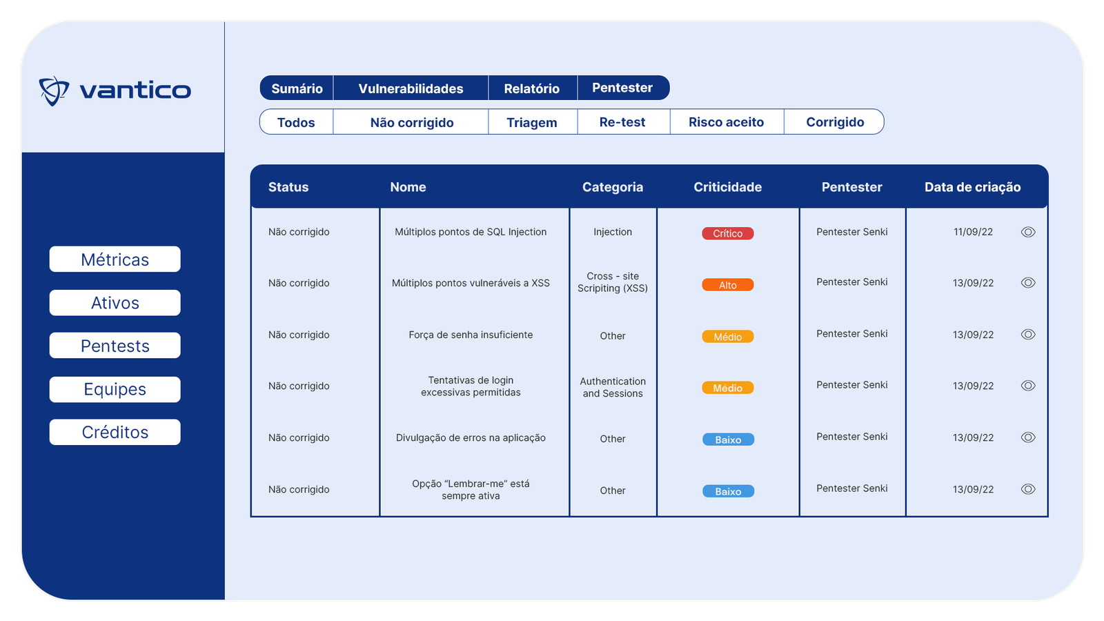 A Vantico também oferece o retest incluso dentro do processo de pentest. Ou seja, após a entrega e correção por parte do cliente, iremos realizar novamente os testes e verificar se, de fato, as vulnerabilidades foram totalmente sanadas.